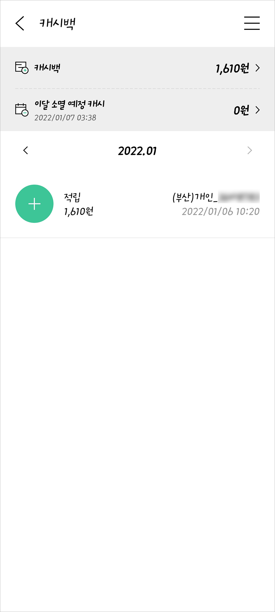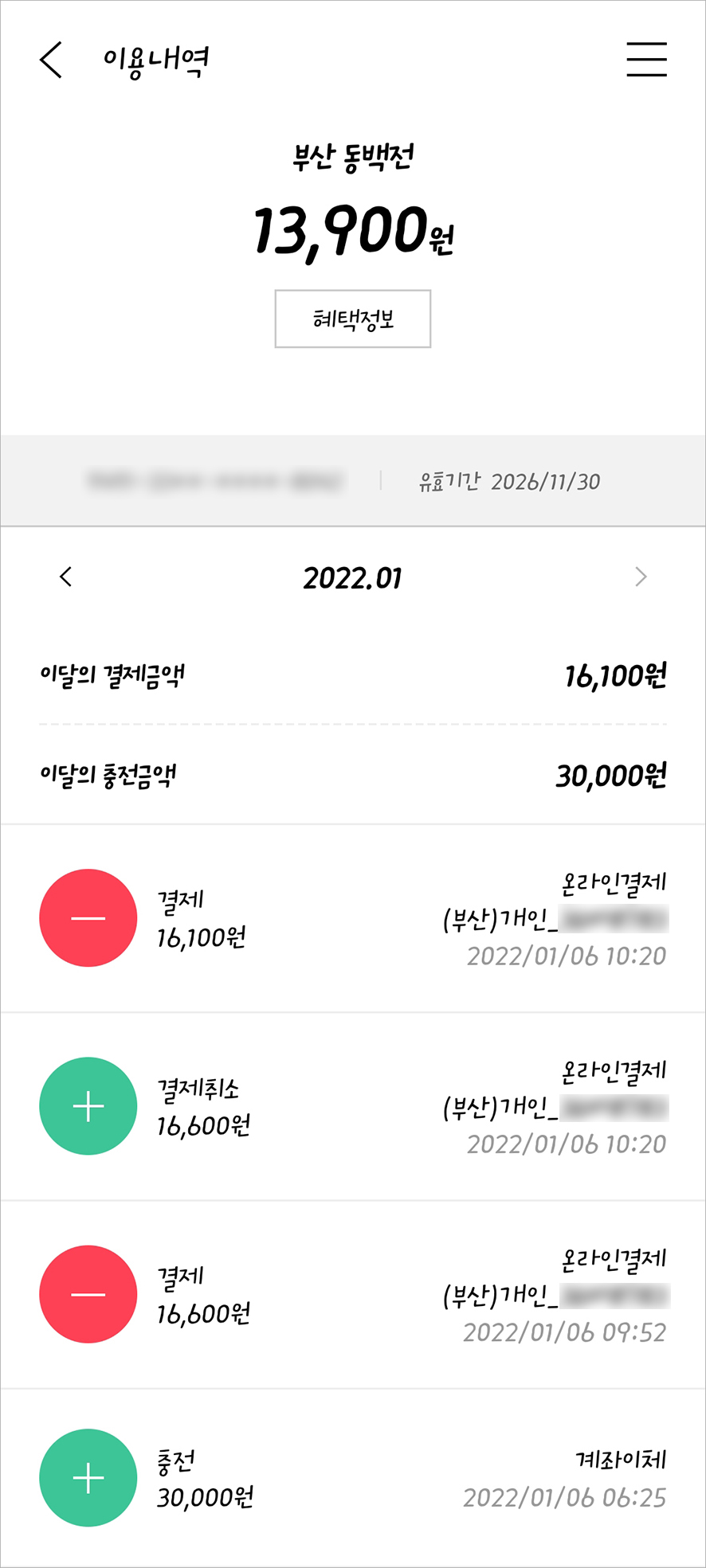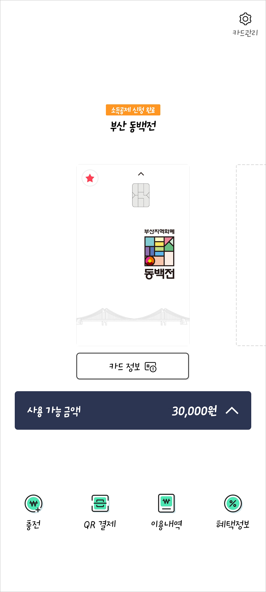 실물 카드는 일단 신청을 하고 받기만 하면 어플에 따로 등록을 할 필요가 없더라고요.자동으로 등록이 되어있었습니다.이 동백꽃패에 계좌를 연결해서 현금을 넣어두고 쓰는 방식이에요.- 간편결제가 가능하다는 점도 편리했지만 무엇보다도 10% 캐시백 혜택이 장점이었습니다.