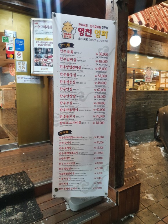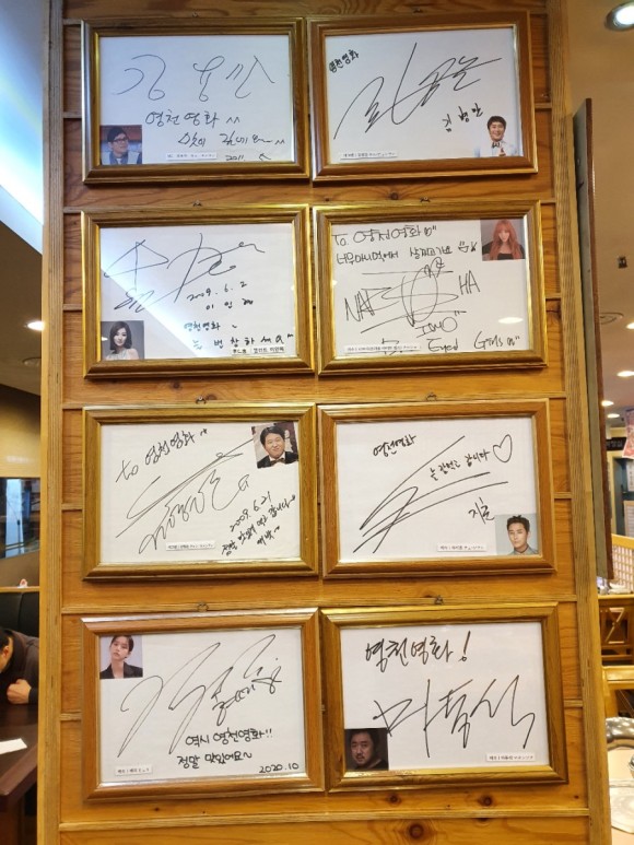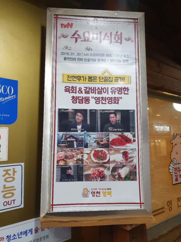 영천영화 청담점은 전좌시의 이영자맛집, 수오미식회의 강남 한우맛집으로 유명하지만 넷플릭스 드라마 스위트홈에 출연한 배우 이시영의 남편이 운영하는 곳으로도 유명합니다. 연예인 사인은 기본이고 최근 몇 달 사이에 방문한 연예인들도 상당수 있어요 한우 육회 160g 38,000원 한우 갈비 130g 48,000원 한우 차돌박이 등심 150g 62,000원 한우 안심 130g 68,000원 한우 안창살 130g 68,000원 한우 불고기 200g 28,000원 한우 차돌박이 130g 40,000원 고기 가격은... 강남한우맛집다운 가격입니다.