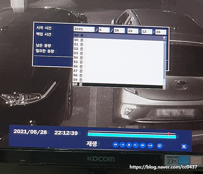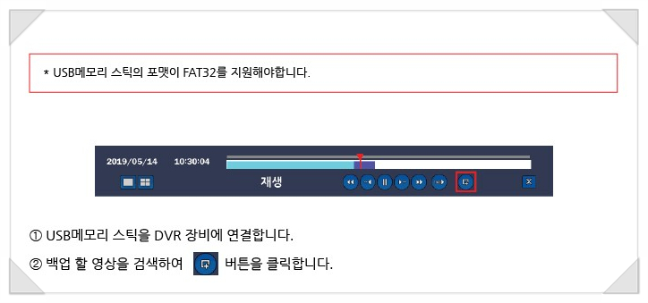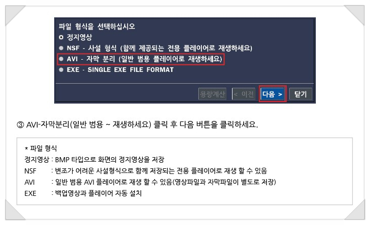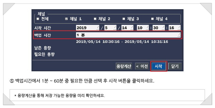 설명서대로 시행하려면 검색하는 방법을 먼저 아셔야 합니다.당연히 아시겠지만 설명서에서는 건너뛴 부분을 아래로 올려보겠습니다. 여기까지 실행한 후 설명서에 표시된 아이콘 "백업"을 클릭합니다. USB 메모리에 치환되는 영상의 파일 형식을 결정하는 순서입니다. 백업된 파일을 곧바로 PC로 확인할 수 있는 파일 방법은, 여러분이 알고 계시는 AVI입니다.1개의 채널의 영상 백업이 필요하다면, AVI로 백업을 받고, 복수의 채널의 영상을 백업 하고, 동시에 같은 시간대의 화면을 보고 싶으신 분은 NSF 형식에서 백업을 받아도 좋지만, 이 때는 관련 전용 프로그램이 없으면 영상 파일도 볼 수 없습니다. 다음은 백업 용량 설정입니다. AP-0405R은 백업 설정 시간을 시작 시간부터 1분에서 60분까지 1분 단위로 설정하여 백업할 수 있습니다. 준비한 USB 메모리에 용량과 준비한 USB메모리에 용량과 저장되는 영상용량을 계산할 수 있는데, 이 때는 아래의 메뉴 중 「용량계산」을 클릭하면 남은 용량과 필요한 용량이 계산되어 표시됩니다. 모든 백업 관련 세팅을 마치고 "시작"을 클릭하면 백업이 이루어집니다. 백업이 100% 완료되면 USB 메모리를 분리하여 다른 PC에 연결하여 백업 영상을 보세요. 도움이 되셨으면 좋겠습니다^^