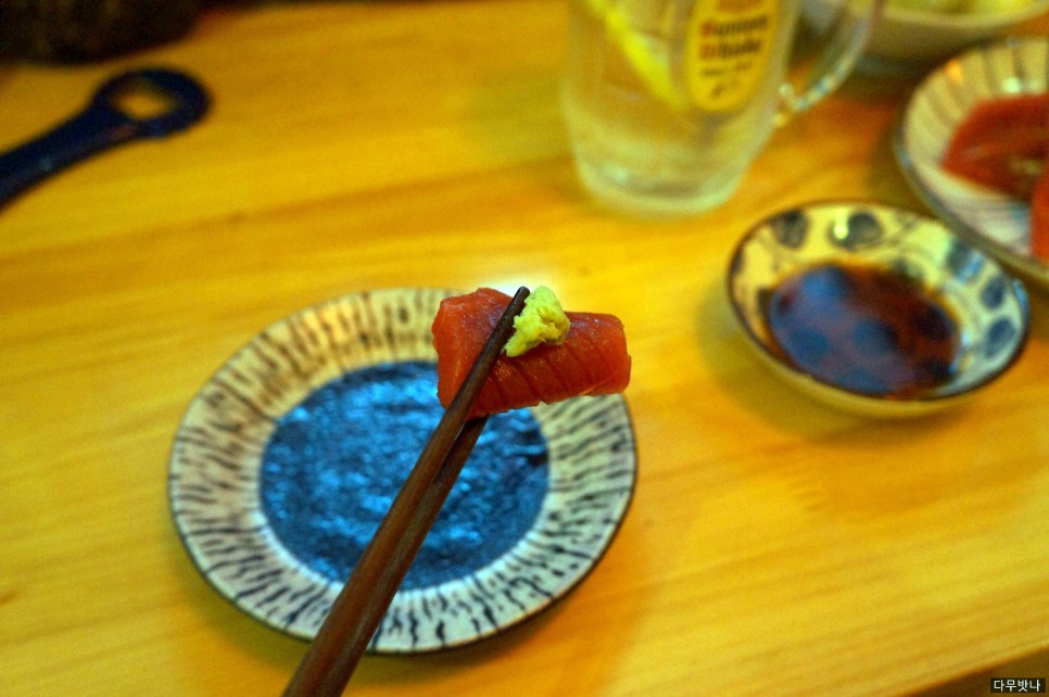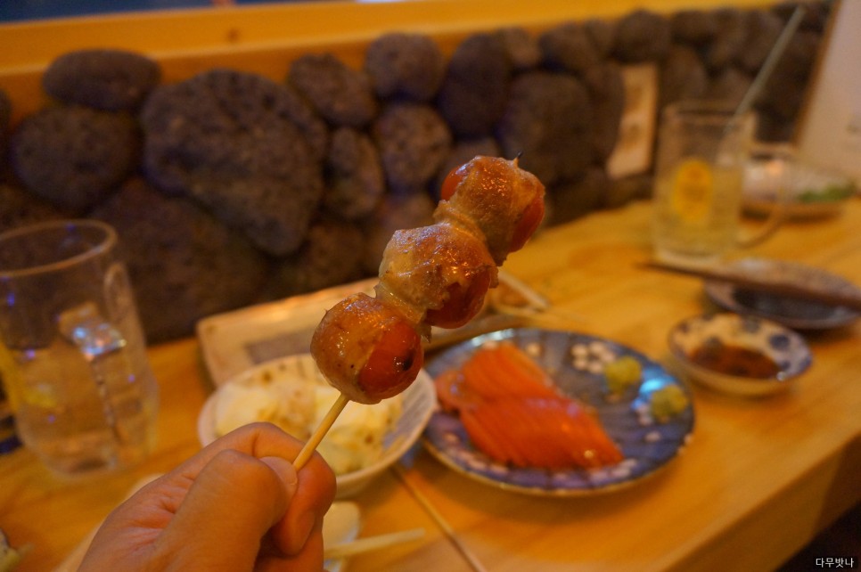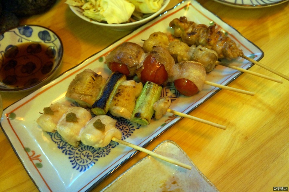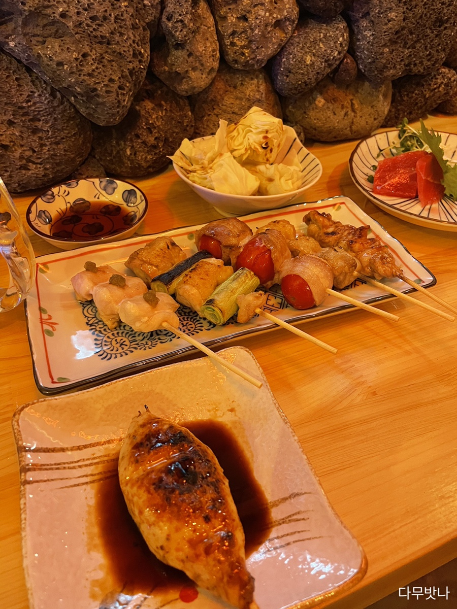 상큼하게 하이보울 한 잔을 마시면 달달한 게 너무 좋아 숙소 수영장에서 물놀이를 하다가 배고픈 저녁은 흑돼지 근육구이로 달래고 난 뒤 시원한 하이볼 한 잔에 에어컨이 필요 없다. 기다리면 미니참치가 나오는데 살코기 부위로 보이는 미니참치이다. 개인적으로 기본이요, 근본적인 부분이 아닌가 싶다. 고추냉이를 튀겨 먹으면 되지만 많이 올리면 코가 뾰족해지므로 취향에 따라 넣는 것이 좋다. 입 안에서 신맛과 단맛 같은 맛이 잘 느껴지기 때문에 굳이 하이볼이 아닌 소주로도 잘 맞지 않을까.(실은, 쳇바퀴가 걸려서 과음은 무서워서 못했어 T T)폭풍만취각이었는데) 이렇게 해서 무 밑에 고추냉이를 올려서 먹어도 돼 술을 마시며 제주에서 만난 하루의 이야기, 담소를 즐기기엔 모자라 추가적으로 나올 것이니 '진짜 안주?'라고 생각해도 좋을 것이다. 참치는 항상 맛있지. 먹다 보면 추가로 나오는 모듬꼬치 6종을 준비해준다 숯도 직접 익혀 불에 직접 구워주기 때문에 번거롭다. 보는 재미도 있고 사장님이 잘 얘기해주셔서 좋았다. 조용하고 일본노래도 있어서 이 순간만큼은 일본 시내 한복판에 있는 것 같은 착각에 빠졌다. 추천꼬치 6종