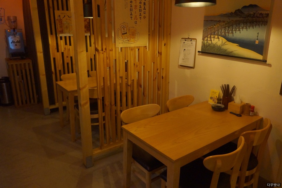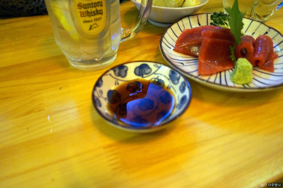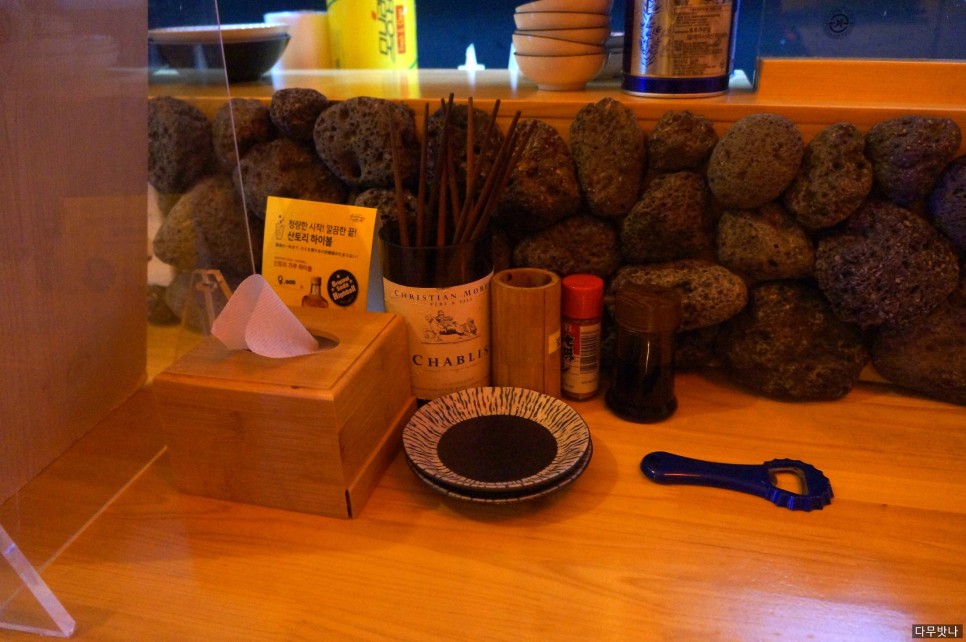 내부에는 타치소쿠와 4인테이블이 3개 정도 있는데 일단 혼술도 가능하니 여러모로 좋을 것 같다. 나는 두 명이니까 공연장에 갔다. 타치석이 뭔가 더 아담해서 좋고, 금방 안주나 술도 나오기 때문에 좋다. 화장실은 가장 안쪽에 위치해 있고 입구에도 메뉴가 있는데 위에는 추천할 만한 메뉴가 있으니 한번쯤 둘러볼 수 있다. 이날 시원한 게 먹고 싶었고 하이볼도 떠올라 맞는 선택이었던 것 같다. 와이파이도 준비되어 있으며 자리마다 젓가락, 휴지, 간장도 준비되어 있어 수저꽂이를 자세히 보면 와인병으로 만들었다. 샤브리와 인병으로 오셨는데 사장님이 술을 잘 아십니다이번에는 동굴 샤부리를 먹어보고 싶다. 식단
