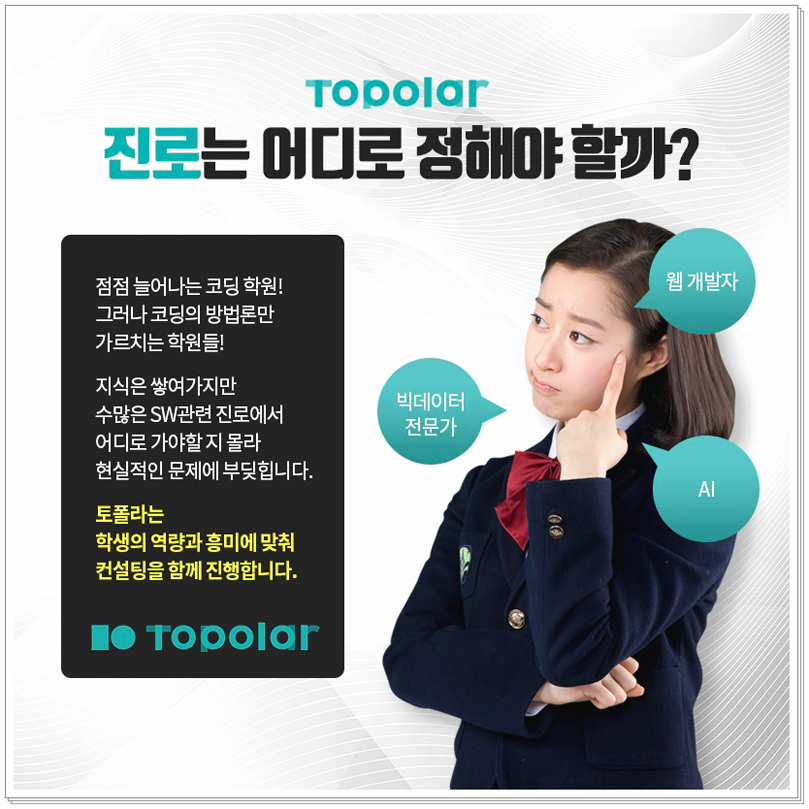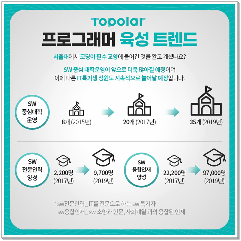 이와 같이 우리 사회에서는 4차 산업혁명 시대가 도래함에 따라 국가 차원에서 다양한 방법으로 SW 인재를 양성하기 위해 많은 노력을 하게 되었고, 미래의 유망 직업으로 IT 분야를 선택하는 분들이 늘어나면서 경쟁률은 더욱 치열해질 것입니다. 그렇기 때문에 정보를 가지고 있다는 것은 내 스펙이 될 수 있는 만큼 어플 만들기에 대해서 고민하고 있다면 신중하게 생각해야 합니다.