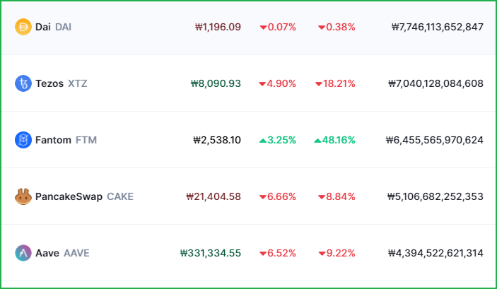 위에 늘어선 토큰들 뿐만 아니라 디파이 생태계의 토큰들은 이 밖에도 꽤 많습니다. 위험을 무시할 수 없는 투자이므로 적어도 거래가 많이 이루어지고 있으며, 향후 발전 가능성도 높은 곳에 투자하는 편이 낫다고 생각하기 때문에 위에 있는 10위권 내의 디파이 생태계나 토큰에 주목하는 편이 좋을 것 같습니다. 참고로, 시가총액은 주식시장에서처럼 항상 유동적이라는 것을 잊지 마세요.