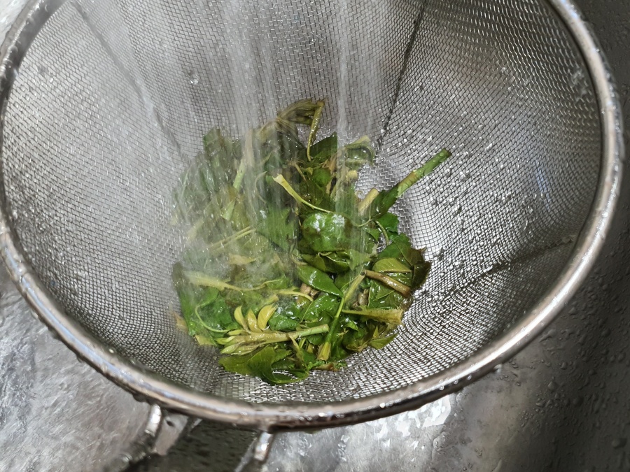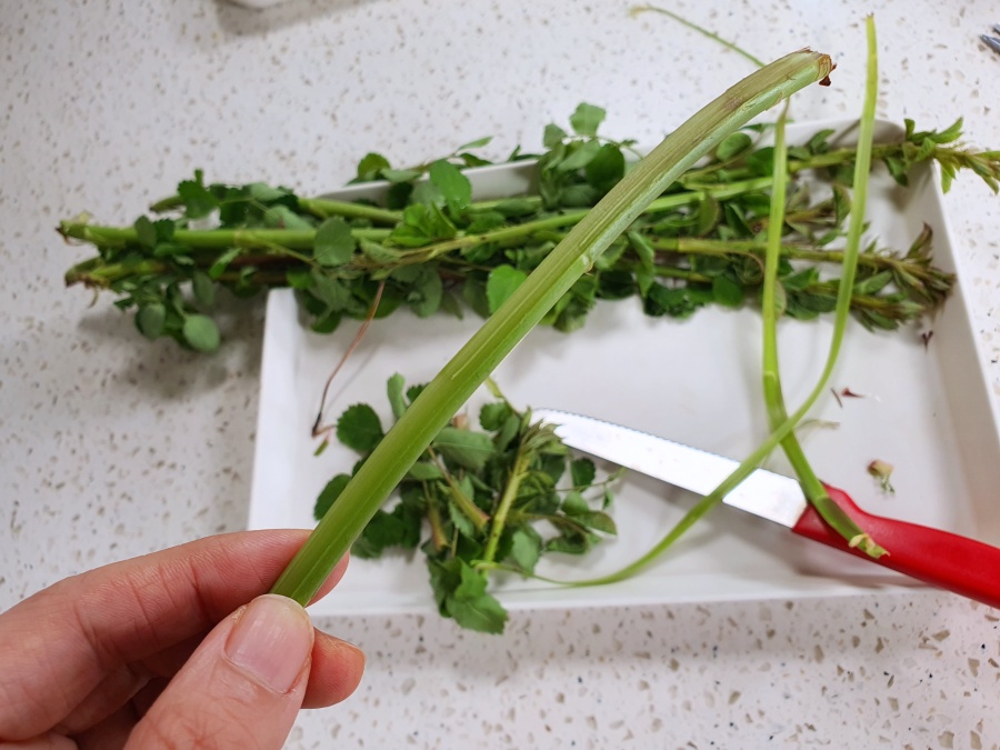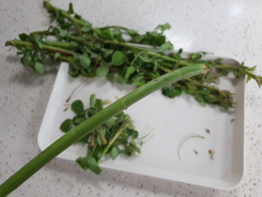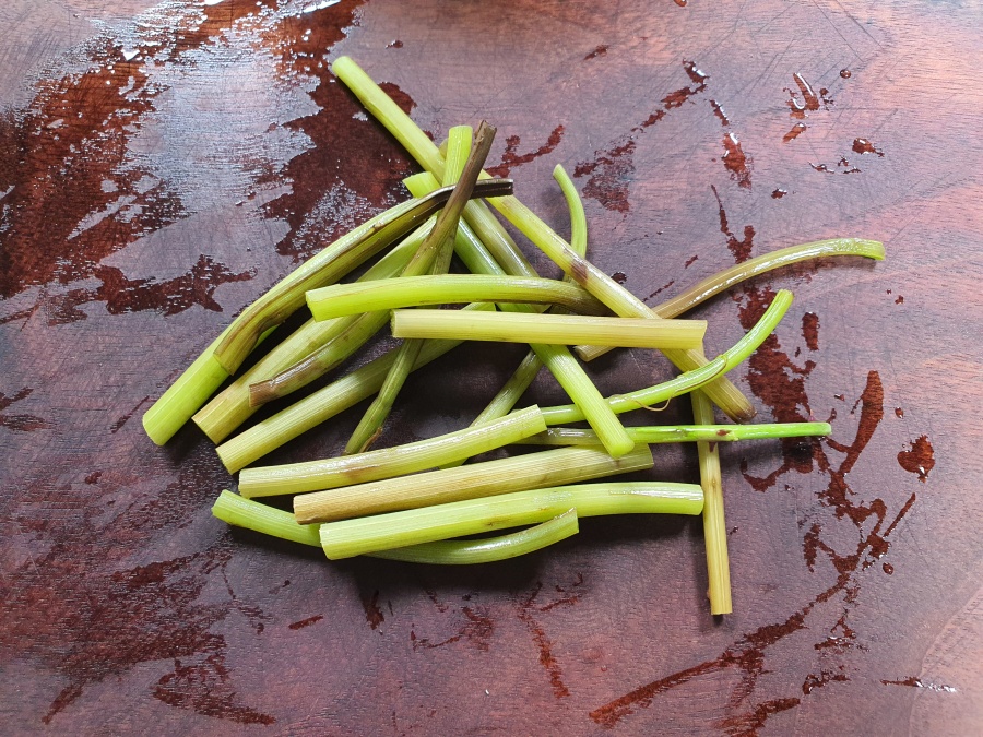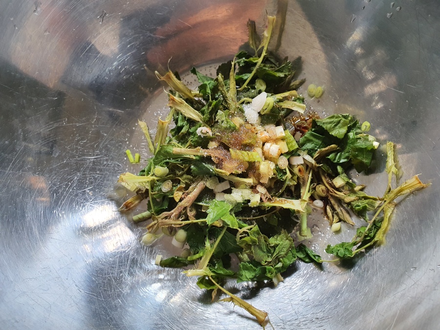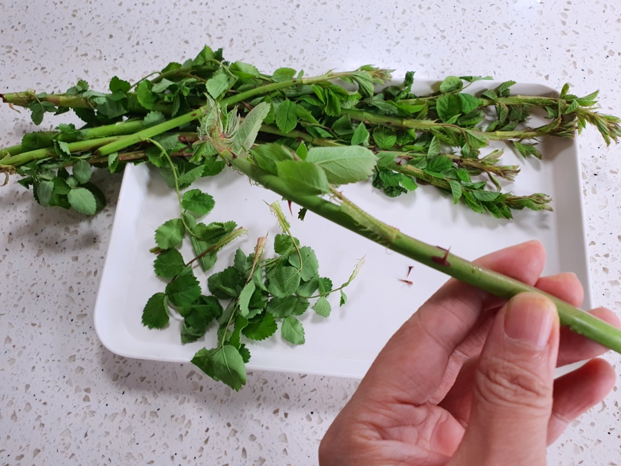 줄기에서 잎은 떼고 뗀다. 근데 연약한 편인데 그냥 나물처럼 부드럽다고 생각하면 안 돼요.목성화된 잎맥은 튼튼해서 나물이나 식용으로 할 때는 잎만 사용한다고 해요. 줄기 끝에서부터 벌려주면 아주 쉽게 껍질이 벗겨져요.아직 무른 상태라 줄기에 있는 가시도 잘 뽑혔어요. 껍질과 줄기입니다. 가장자리에 약한 부분은 나물 무칠 때 같이 썼어요 끓는 물에 소금을 넣고 살짝 데치도록 합니다. 찬물로 헹구어 주거나 물기는 꼭 짜서 준비하세요 발사믹 소스 저번에 자세히 알려드렸는데 진간장+발사믹 식초+올리브오일+설탕+깨로 만들어주시면 되는데 워낙 소량이라 소스를 따로 만들지 않고 금방 버무렸습니다. 상세 소스 비율 링크를 참조하십시오.^^